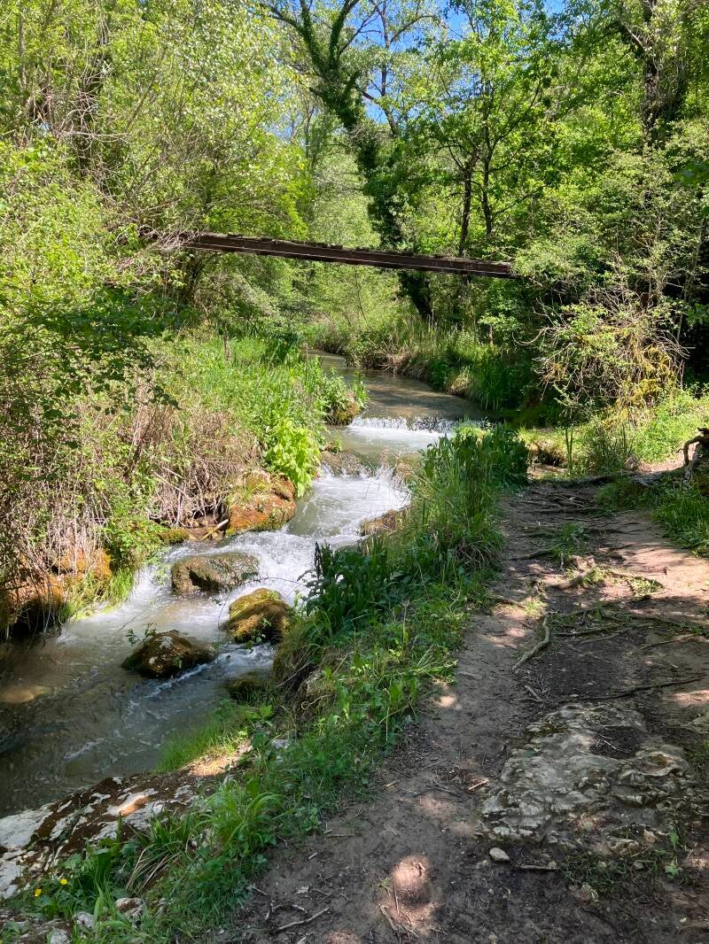 - MAIS ! Enfin une personne, la seule, qui me dit que dans la bas du village le bar-café est ouvert et surtout qu’au lieu de suivre le GR4, il faut longer un superbe petit chemin le long du « Colostre ». Même contrarié mon GPS me montre la voie. Magnifique ! Jusqu’à l’arrivée à Gréoux les Bains le temps s’est arrêté, le rythme de mes pas n’avait plus d’importance, tout comme l’heure d’arrivée ou les km/h. Le seul balisage était le bruissement de l’eau qui m’amenait sans aucun effort à ma destination avec en plus la joie de retrouver un Verdon couleur transparente et non plus turquoise, dans lequel ma petite rivière se jetait.